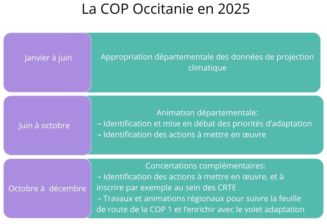 La COP Occitanie a été lancée en décembre 2023. Le premier cycle de COP s’est déroulé de fin 2023 à fin 2024, il a été consacré à la réduction des émissions de gaz à effet de serre (GES) et à la préservation de la biodiversité et des ressources (phase 1). Un deuxième cycle (phase 2), lancé en 2025, sur la thématique de l’adaptation au changement climatique, vient compléter cette première phase.